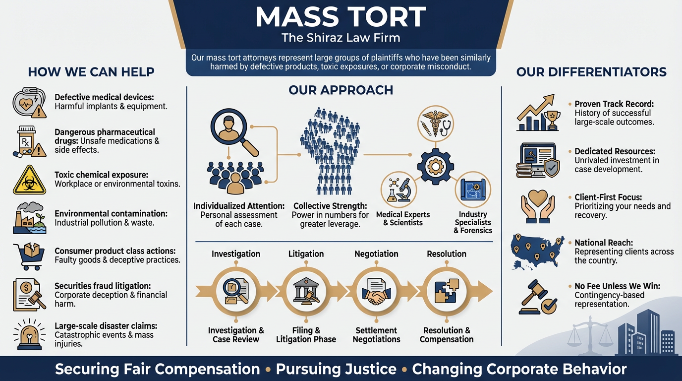 Mass tort litigation involves representing numerous plaintiffs who have suffered similar injuries from the same product or corporate action. The Shiraz Law Firm has the expertise and resources necessary to handle these complex cases effectively.