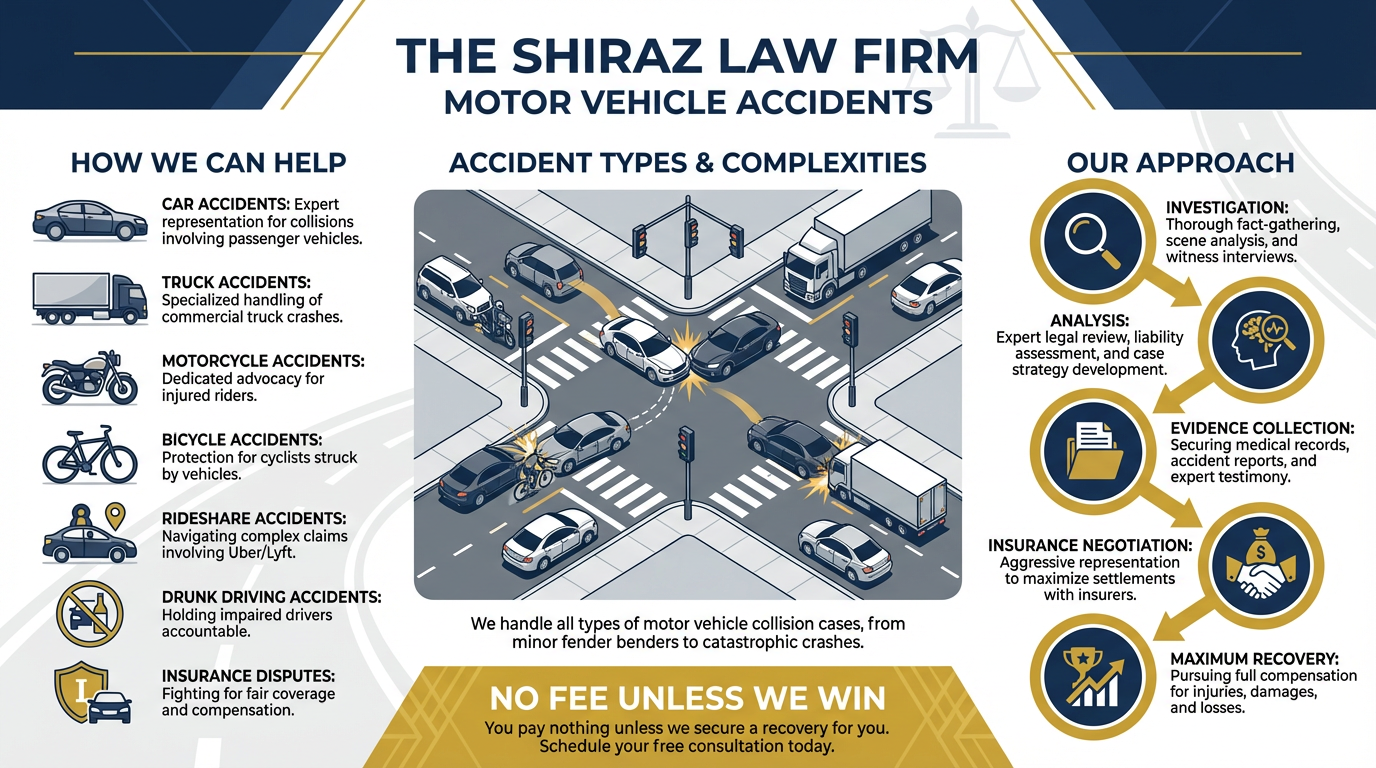 Motor vehicle accidents can cause serious injuries, property damage, and significant disruption to your life. The Shiraz Law Firm has extensive experience representing clients involved in all types of vehicle collisions.