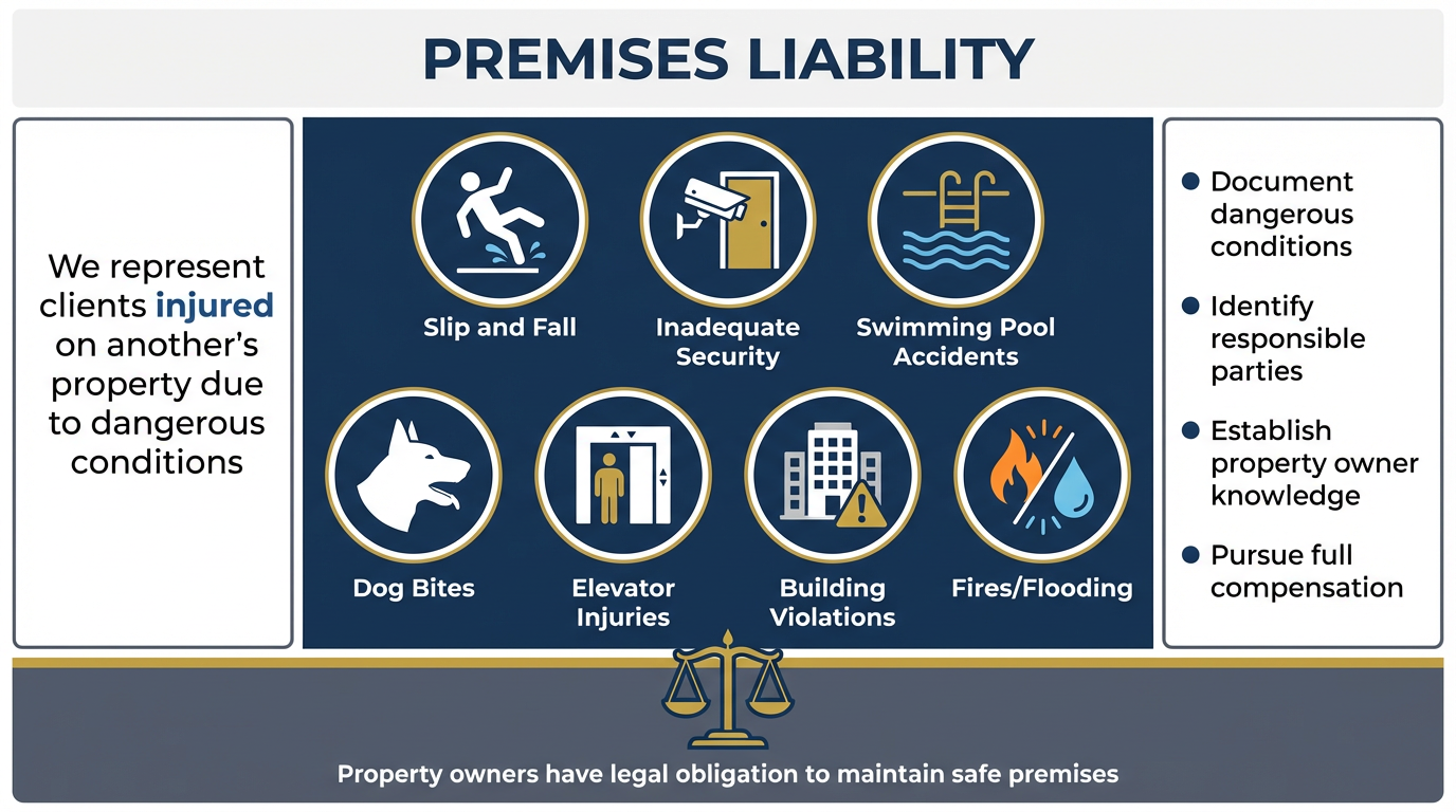 We represent clients injured on another's property due to dangerous conditions or inadequate security. Property owners have a legal obligation to maintain safe premises, and we help hold them accountable when they fail to do so.
